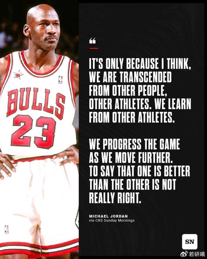 对于外界争论不休的GOAT话题,乔丹态度鲜明地直接否认,直言这项争议毫无意义。在他看来,根本不存在所谓的史上最佳球员,强行评判谁比谁更优秀,本身就是不公平、不准确的。乔丹表示,篮球运动的发展离不开传承与接力,每一代球星都是从前辈身上汲取经验、学习技巧,再通过自身的努力突破自我,进而推动整个运动不断进步。所有脱颖而出的球星,都在为篮球发展贡献力量,没有高低优劣之分,不该用单一标准去定义谁是最佳。